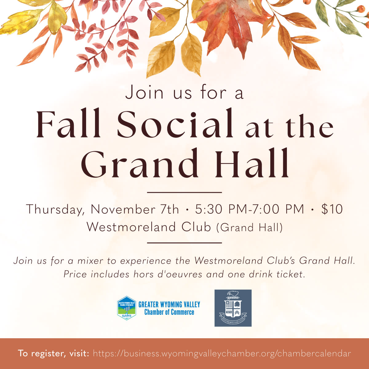 Join us on Thursday, November 7th at 5:30pm in the Westmoreland Club's Grand Hall for a Fall Social. Mix and mingle while enjoying the beautiful venue of the Grand Hall. Don't forget your business cards! $10 registration fee is required, which includes hor d'oeuvres and one drink ticket.