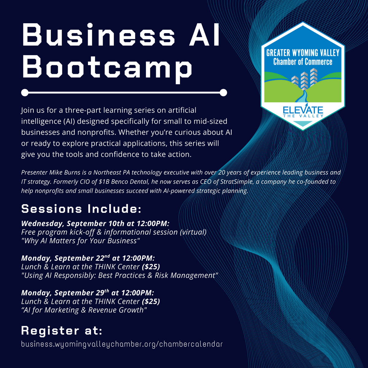 Presenter Mike Burns is a Northeast PA technology executive with over 20 years of experience leading business and IT strategy. Formerly CIO of $1B Benco Dental, he now serves as CEO of StratSimple, a company he co-founded to help nonprofits and small businesses succeed with AI-powered strategic planning.