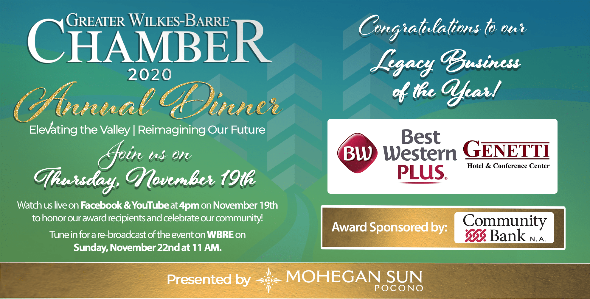Make sure to join us for our Chamber Annual Dinner on November 19th at 4 PM LIVE on Facebook and YouTube to celebrate Best Western Plus Genetti Hotel and the rest of our honorees that night! Click here to register today!