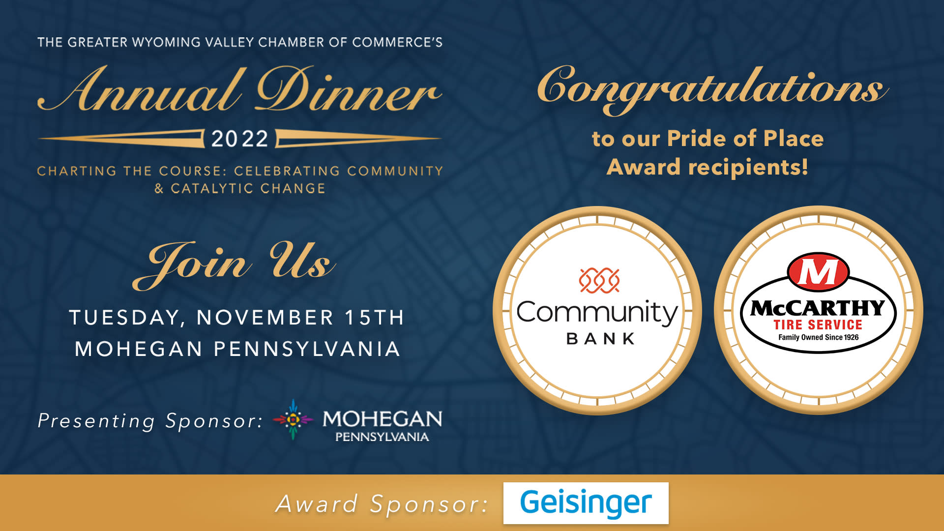 Make sure to join us for our Chamber Annual Dinner on November 15th to celebrate Community Bank and McCarthy Tire Service and the rest of our honorees that night! Click here to register today!