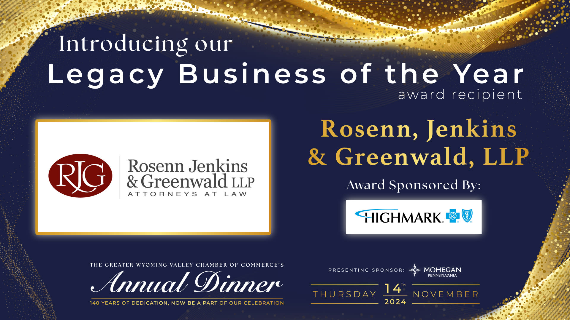 "Rosenn, Jenkins & Greenwald, LLP is honored to be the recipient of this year’s Legacy Business of the Year Award from The Greater Wyoming Valley Chamber of Commerce.