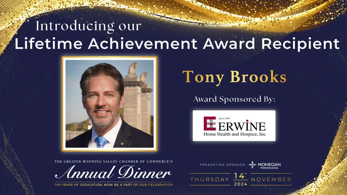 Active in the community, Brooks currently serves as chairman, WVIA’s Community Advisory Board; president, University of Pennsylvania NEPA Alumni Club; board member, Luzerne County Convention & Visitor Bureau, Luzerne County Arts & Entertainment Hall of Fame, Wyoming Valley Art League, Hollenback Cemetery Association, Nesbitt Family Charitable Foundation, Osterhout Free Library, Wyoming Commemorative Association, Anthracite Heritage Foundation, Forty Fort Meeting House Preservation Committee, Wilkes-Barre Law & Library Association, Diamond City Partnership, Little Theatre of Wilkes-Barre, Family Services Association and Kirby Health Center. He is past president of the St. David’s Society of Wyoming Valley and former board member of the Luzerne County Historical Society, the Historical Marker Review Committee of the Pennsylvania Historic and Museum Commission and served our country with the 104th Cavalry, Pennsylvania Army National Guard.