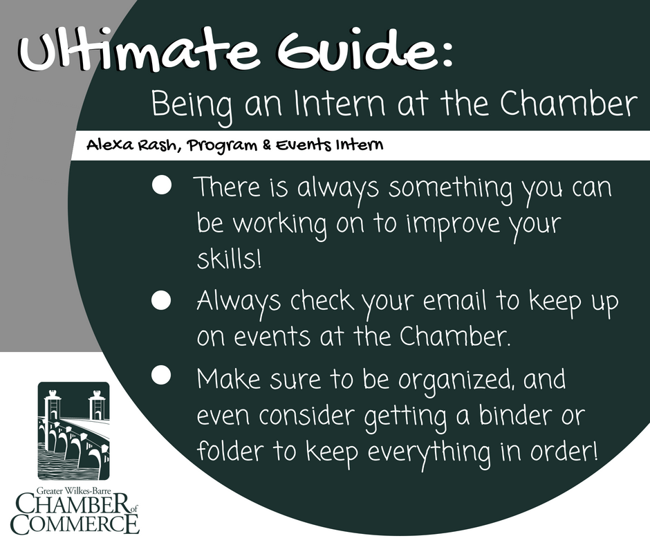Alexa works as a Program and Events Intern at the chamber. She has the opportunity to work with Ahmad Ali, the Program and Events Coordinator, and Meghan Flanagan, the Communication and Resource Manager. Her typical day consists checking her email (see tip #2!), and then corresponding with Ahmad and Meghan to see what tasks she needs to complete for the day. Over the course of her internship, Alexa has been working on organizing for the upcoming Golf Tournament and Small Business Saturday: Christmas in July events. For the Golf Tournament, she has been calling businesses and teams who participated last year and seeing if they wanted to sponsor or play in this year’s tournament. For Small Business Saturday: Christmas in July, Alexa has been actively reaching out to businesses and seeing if they wanted to offer discounts for the event. Overall, interning at the chamber has allowed Alexa to truly understand the importance of organization in the business world. She always tries to keep all of the events she is working on as organized as possible, which she believes helps contribute to a successful event. Alexa plans to maintain this mentality in her future career.