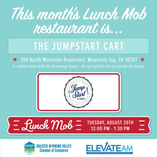 We are excited to announce The Jumpstart Cart as our August Chamber Lunch Mob Location! This will be in collaboration with the Broadway Tavern in Mountain Top - the food truck will be set up outside the venue and seating inside. Address (259 North Mountain Boulevard, Mountain Top, PA 18707)