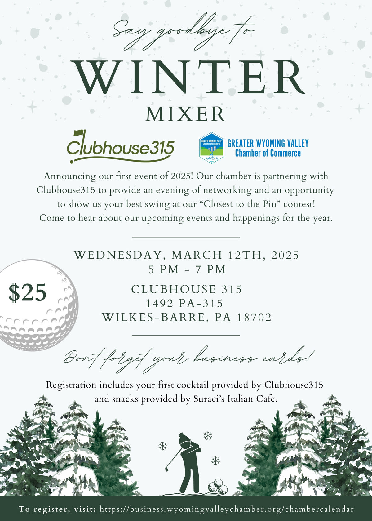 Kick off the year with a swing at our first Winter Mixer Networking Event! Join us on March 12th at Clubhouse 315, where business connections meet fun on the greens. Whether you're looking to check out the venue or just looking to connect with local professionals, this event offers a perfect blend of networking and entertainment in a relaxed setting. Your ticket price includes your first drink, some delicious snacks provided by Suraci’s, a swing at our "Closest to the Pin" contest for a chance to win a prize, and the ability to test your driving skills out on one of the simulators!