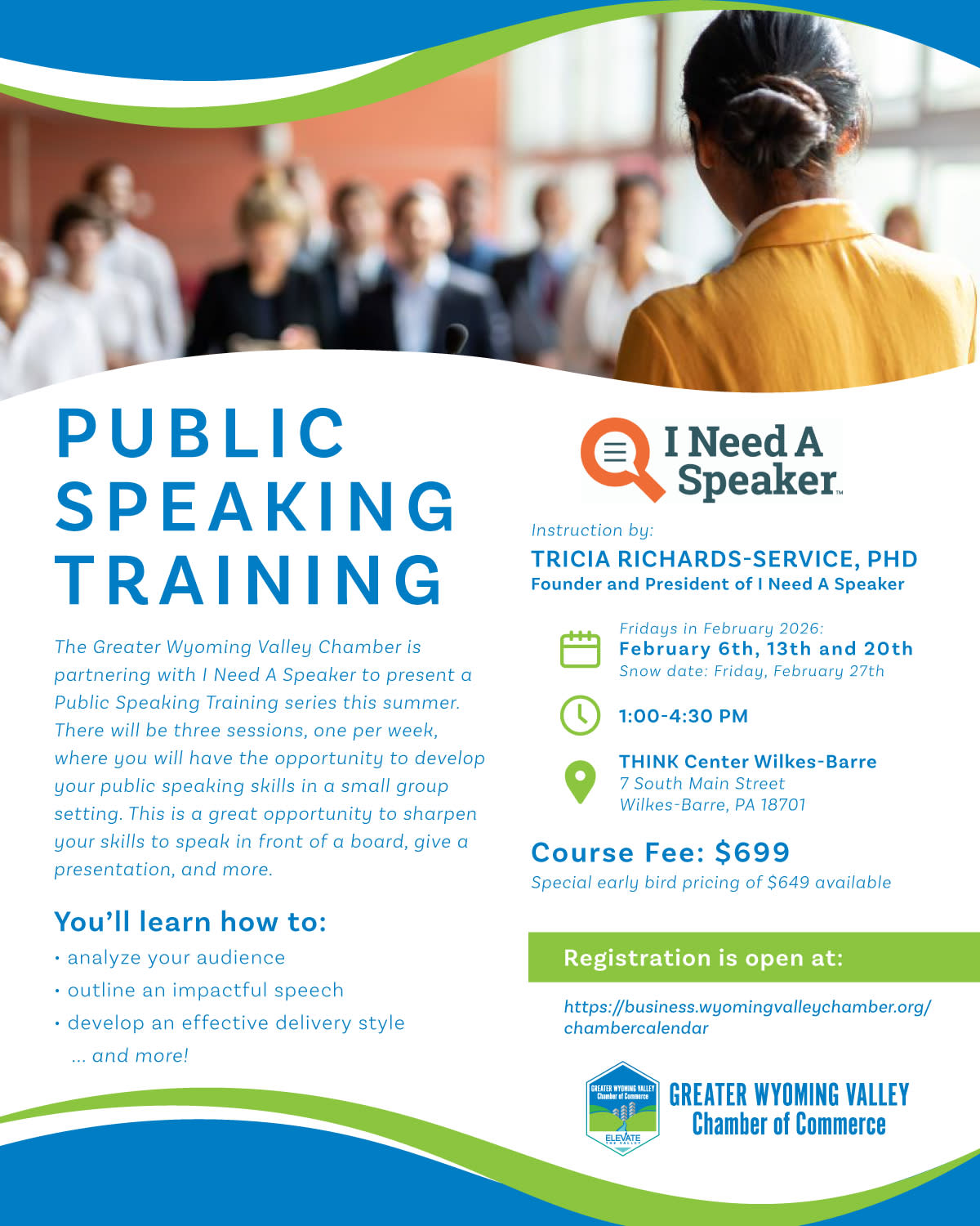 Join us for this exclusive public speaking training course hosted at Wilkes-Barre's Think Center. Led by Tricia Richards-Service, PHD., Founder and President of I Need A Speaker, this transformative program is designed for individuals and professionals ready to elevate their communication skills.