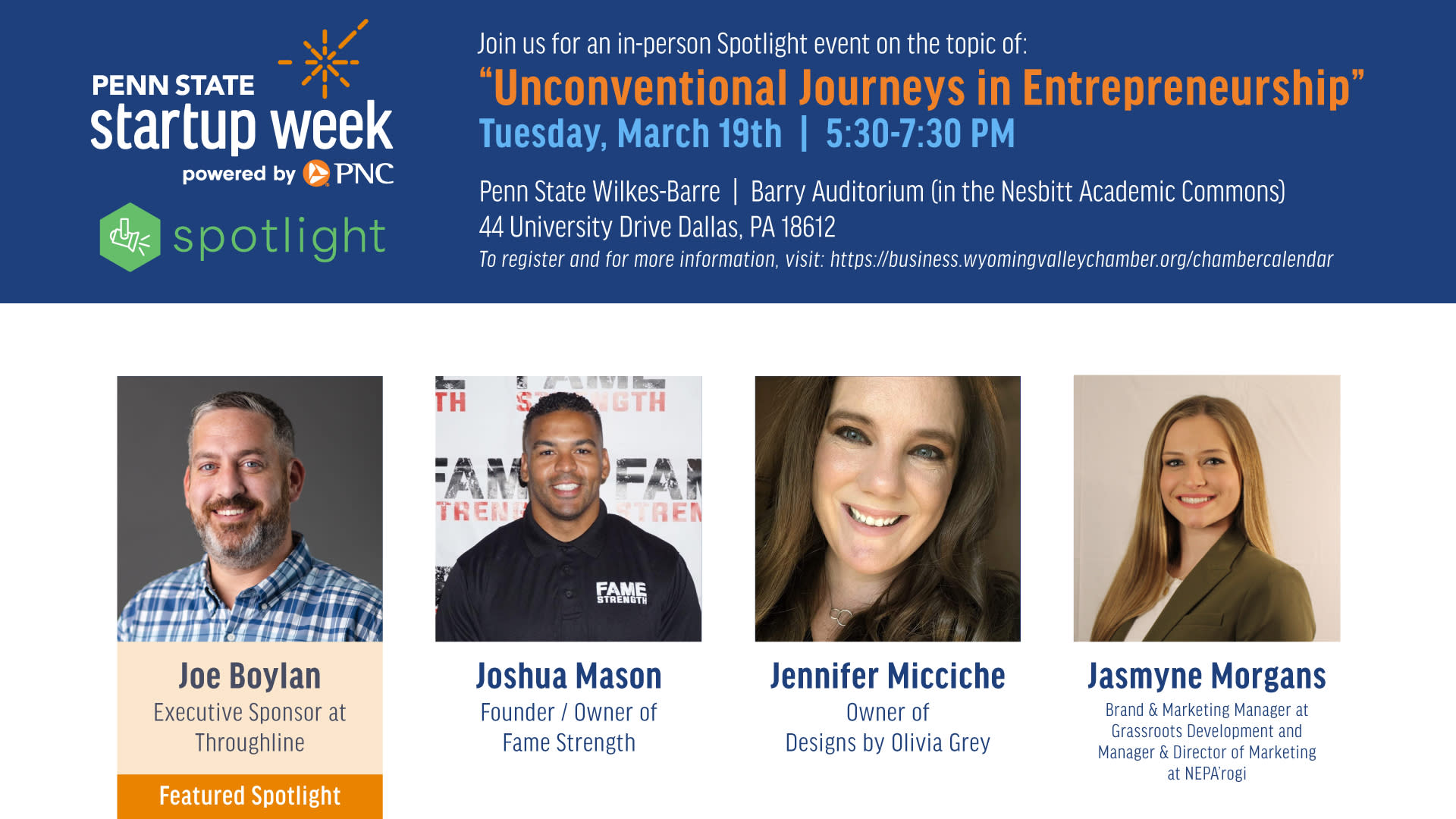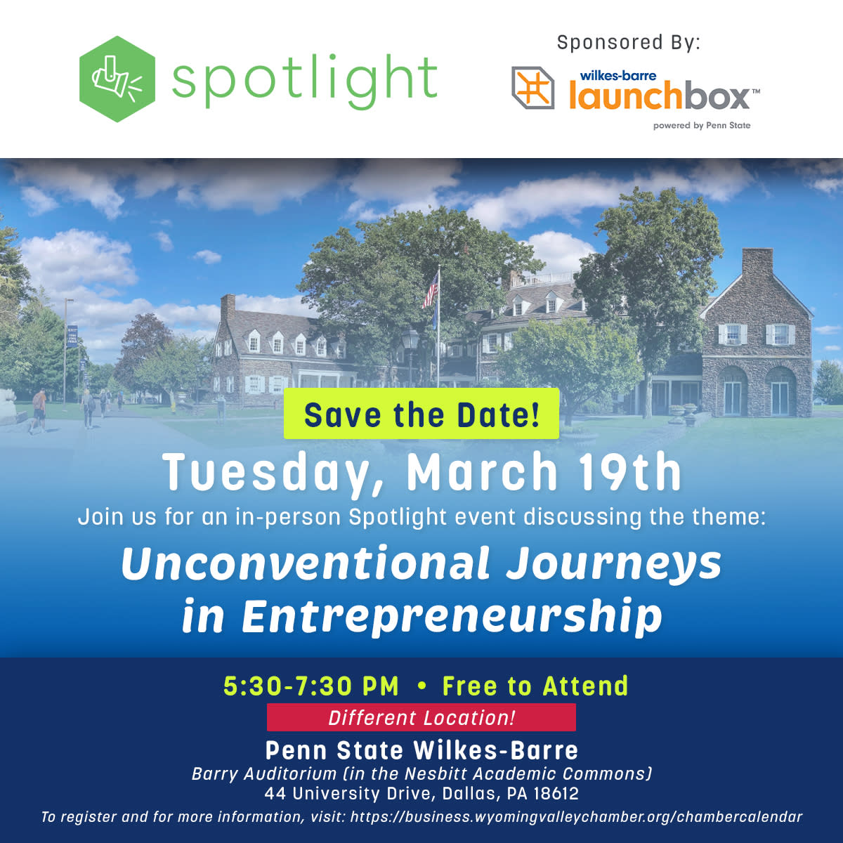 The Spotlight program features quarterly events that provide an opportunity for industry leaders and entrepreneurs in NEPA to meet, discuss and identify potential partnerships. Each event features a fifteen-minute presentation from an entrepreneur with regional ties, as well as shorter spotlights featuring local entrepreneurs, students, and non-profits. Spotlight is a Wilkes-Barre Connect program coordinated by the Diamond City Partnership and sponsored by Penn State Wilkes-Barre, through the Invent Penn State initiative.