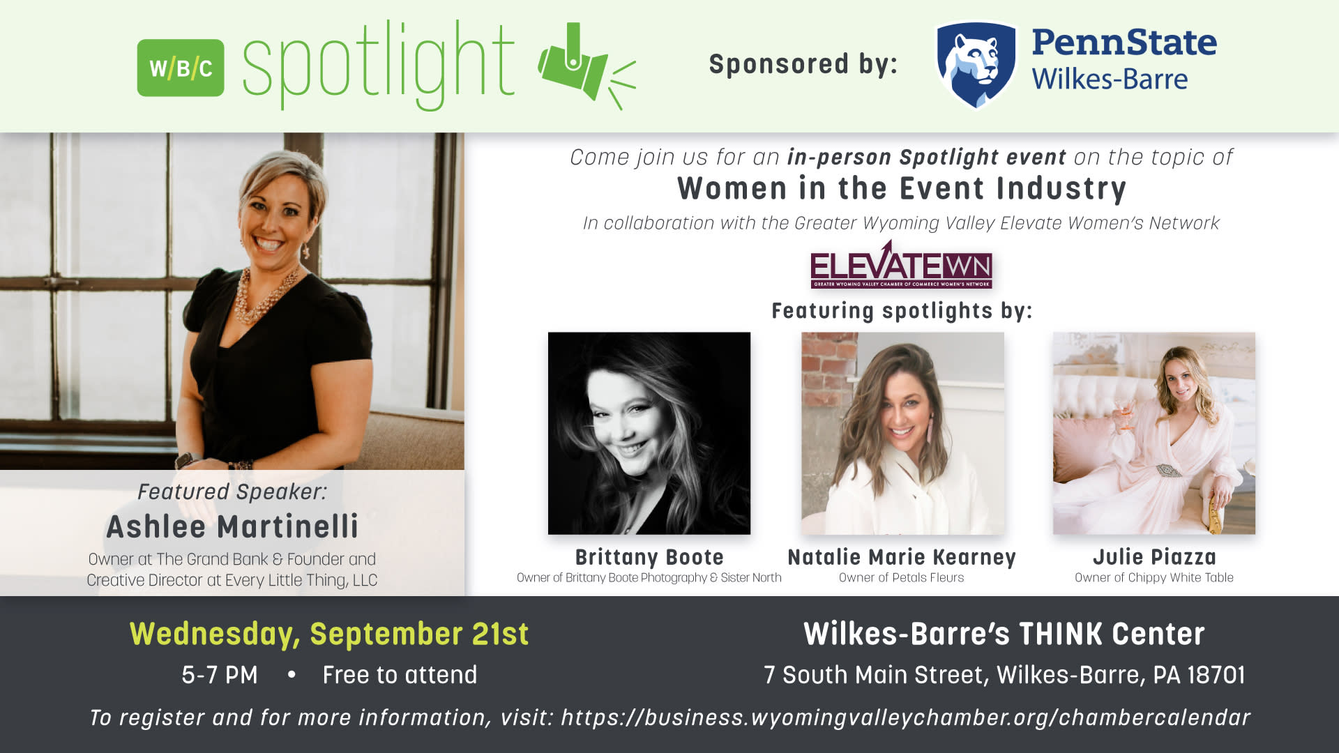 This quarter's Spotlight is in collaboration with the Greater Wyoming Valley Elevate Women's Network, and is dedicated to Women in the Event Industry, highlighting some of our area's incredible women entrepreneurs. There are so many moving parts that go into making an event come together, and the road to fulfilling creativity looks different for everyone. This event's speakers will showcase their work, their stories, and their thoughts on pursuing the industry at a young age and how it plays into female entrepreneurship. Members of the community and local students in attendance will get the opportunity to hear these stories, network and connect with those working in this space, and see examples of their work. Learn more about our speakers below: