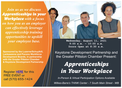 Join us ad we discuss Apprenticeships in your workplace with a focus on how you as an employer can effectively leverage apprecticeship training opportunities to upskill your employee base.Sponsored by the Luzerne/Schuylkill, Lackawanna and Pocono Workforce Development Boards, in partnership with the Greater Pittston Chamber & Keystone Development Partnership
