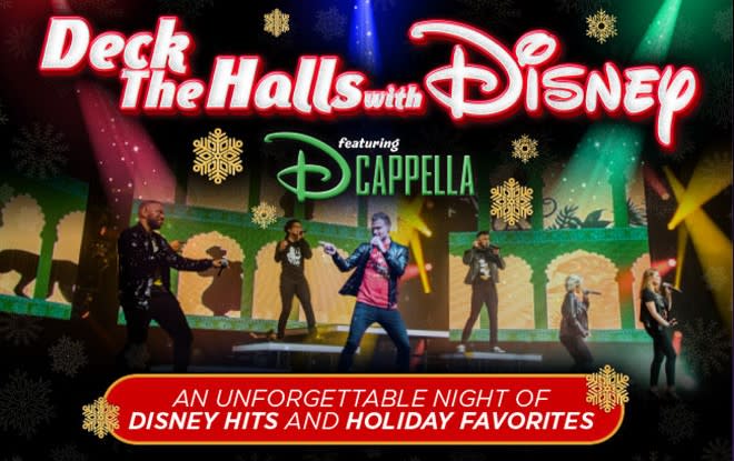 Disney Concerts presents Deck the Halls with Disney featuring DCappella. Delight in a family night-out set to the magical and musical sounds of Disney’s premier a cappella singing sensation DCappella! Kick off the holiday season as DCappella takes you through a musical journey featuring all of your favorite holiday songs PLUS Disney’s greatest hits from Encanto, The Little Mermaid, The Lion King, Frozen, Moana, and much more!