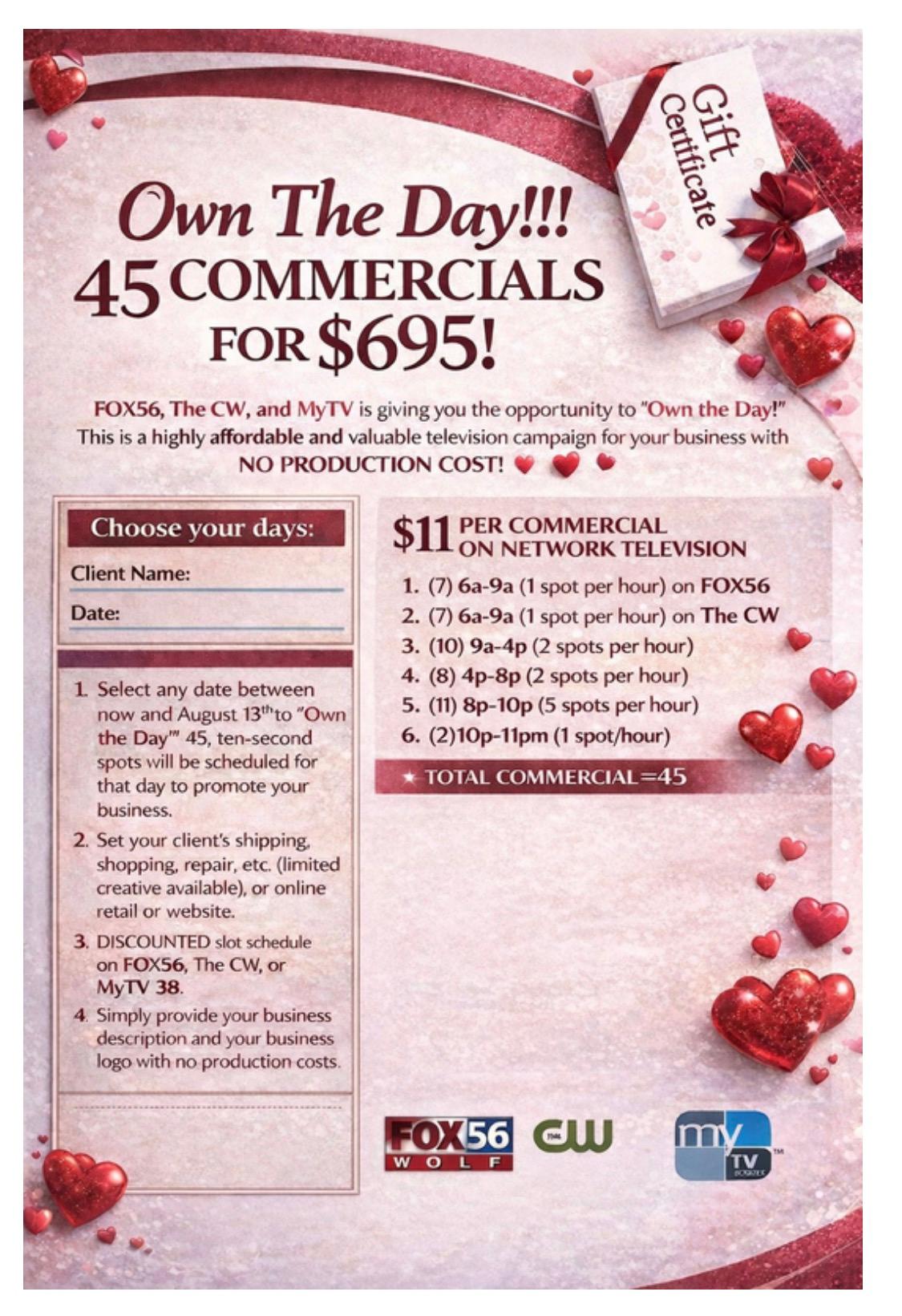 FOX 56- 45 Commercials for $695! Back to Hot Deals FOX 56- 45 Commercials for $695! By FOX56 WOLF-TV 2/9/2026 Own Valentines Day on Fox56 and let Cupid 💘 shoot your revenue to the stars on Love's #1 Date Night. Images × Share × Email Facebook LinkedIn X Pinterest Powered By GrowthZone