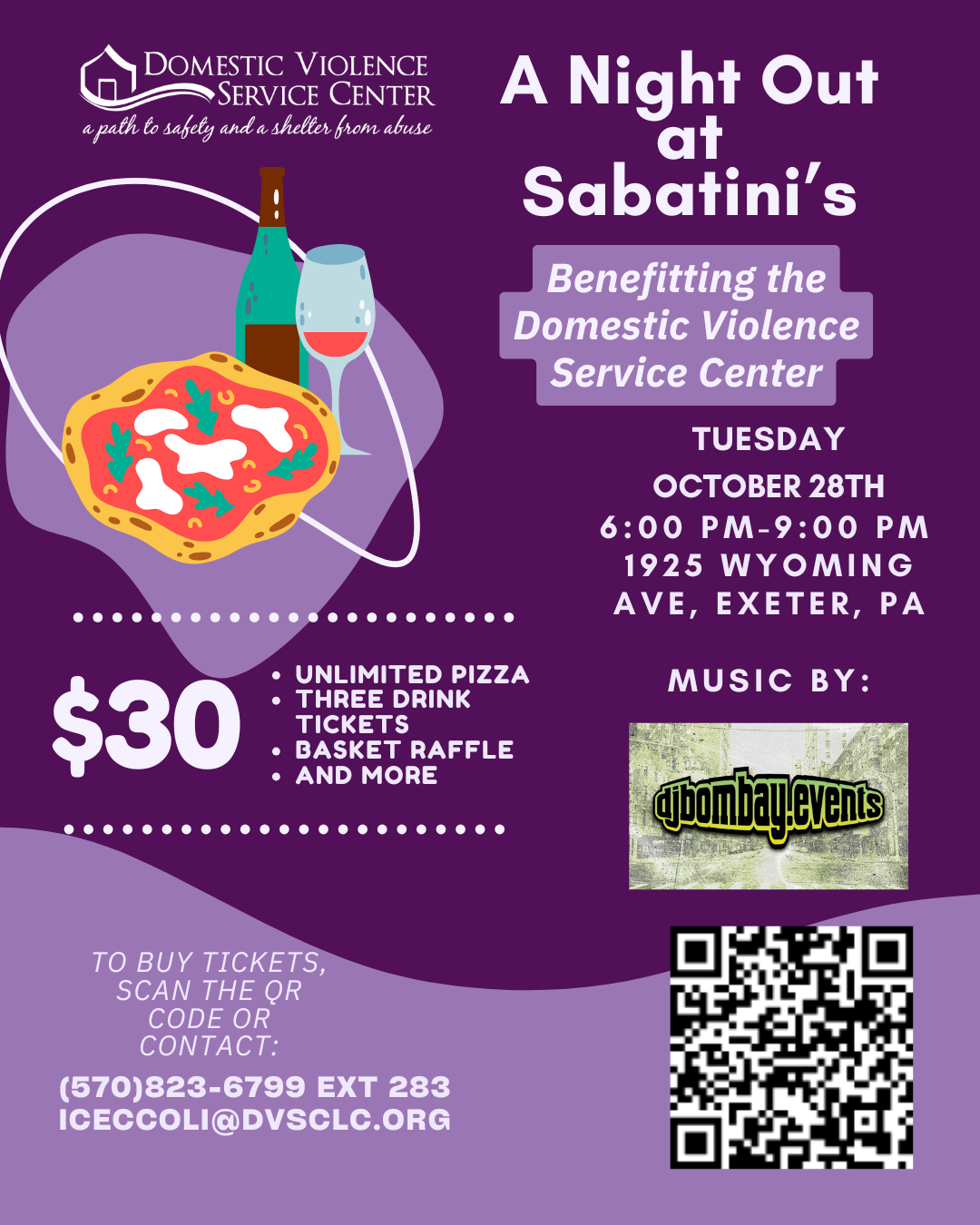 (Wilkes-Barre, PA, October 2025)- The Domestic Violence Service Center will host their fundraising event, A Night at Sabatini’s, on October 28th, 2025 from 6:00 PM-9:00 PM at Sabatini’s Bottleshop and Bar. Tickets are $30, and you get unlimited pizza and 3 drink tickets. To purchase tickets, email iceccoli@dvsclc.org, call (570)823-6799 ext. 283, or visit the following link. The event is 21+.